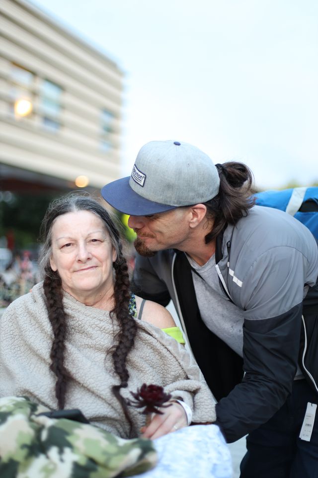 Frankie Thompson pushes his mom, who was discharged from Stanford Hospital, in a wheelchair. With all their bags packed, his mom is ready to return home to her two dogs. Thompson, though, is returning to a drug treatment facility. He said he left the facility this weekend so he could be by his mother’s side.