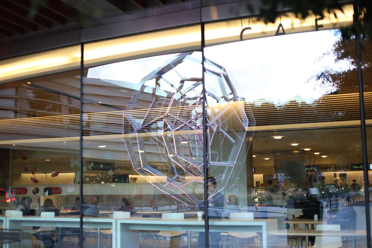 It’s 6:22 p.m. and Stanford Hospital’s cafe is not closed. As customers enjoy what the cafe has to offer, Leo Villareal's Buckyball, a 30-foot sculpture of illuminated geodesic domes, lights up the windows of the cafe.
